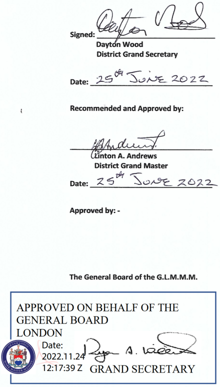The District Grand Lodge of Mark Master Masons of Jamaica and Cayman Islands (hereinafter styled District Grand Lodge) shall meet annually on the 4th Saturday in June and shall also meet on such days and at such times and places to be appointed by the District Grand Master.
